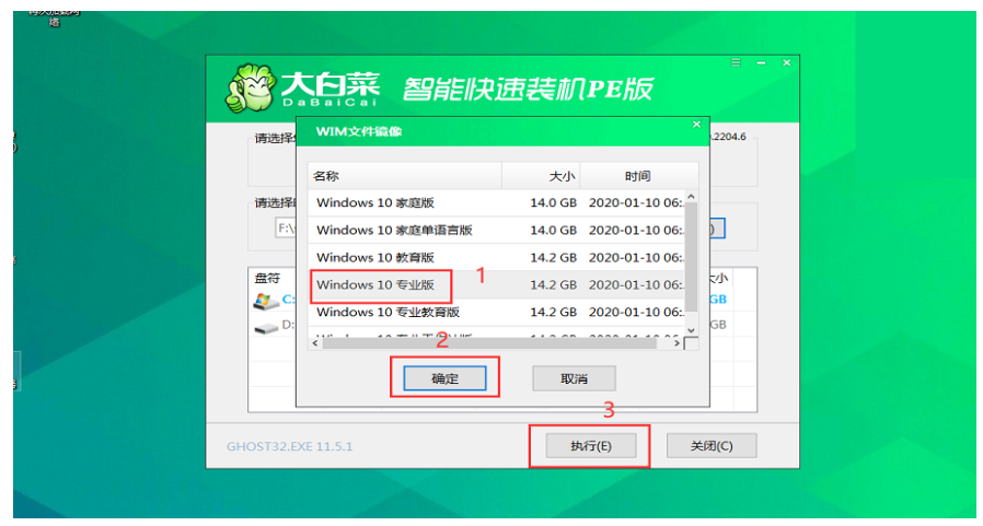 4、然后选择U盘中提前下载好的ISO镜像文件进行安装,参考下图:选择“windows10专业版”点击“确定”,再点击“执行”在大白菜一键还原窗口。