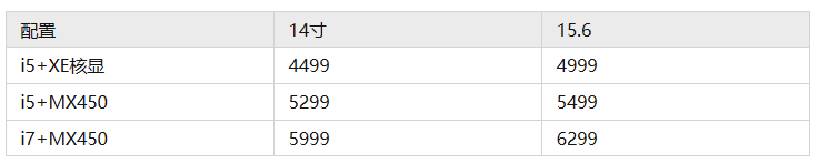 内存均标配16G,主要差别在MX450显卡部分,其实一般使用XE核显完全足够,打3D游戏会差点,但是网游影响不大,女生最建议的是4499的核显型号,性价比超高。如果有较多的视频处理或者3D的,选择贵一些的MX450版本。另外还有一个性价比非常高端锐龙版本(除了Cpu之外,只有雷电接口的差别)