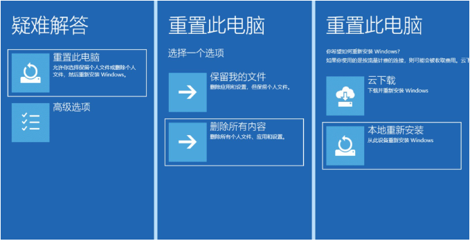 点击重置此电脑 - 删除所有内容 - 本地重新安装。