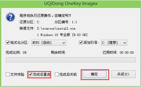 3、弹出程序将执行还原操作窗口,勾选完成后重启复选框,点击确定按钮,如图: