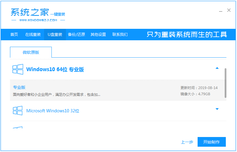 2、选择win10专业版系统,点击开始制作u盘启动盘。