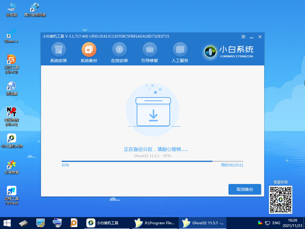 5、这里选择是进入 PE 系统执行 Windows 11 备份,所以进入后会自动打开小白工具开始执行备份。备份完成后选择立即重启。