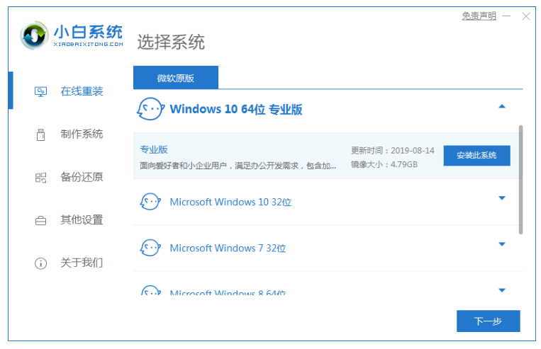 步骤三:电脑进入页面后,我们在左侧选择在线重装功能,此时选择好自己需要的安装的系统版本后,选择安装此系统。