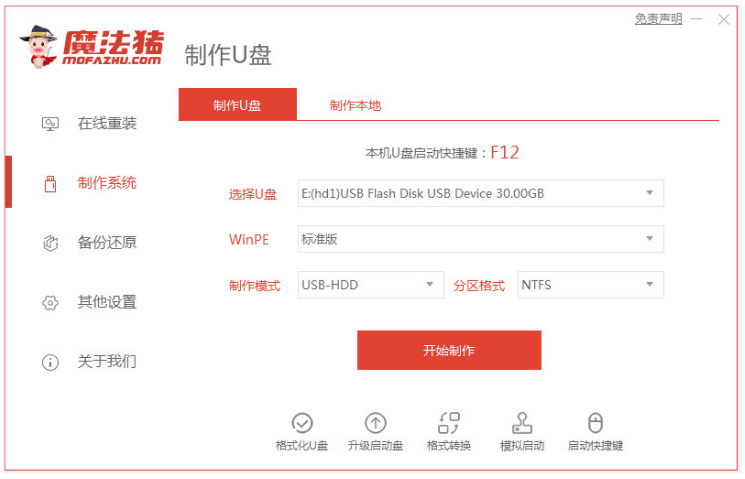 1、在一台可以正常使用的电脑上下载安装好魔法猪一键重装系统工具,插入空白u盘到电脑上,选择制作系统点击开始制作。